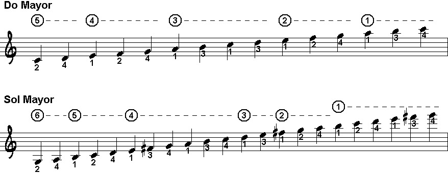 digitación de estas escalas varía dependiendo de la escuela, el método o maestro, pero comparten reglas básicas.