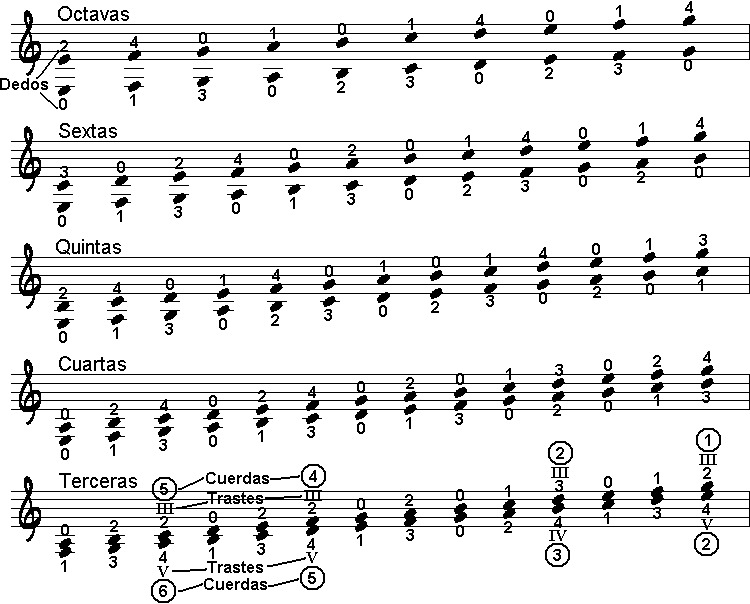 En las terceras se utilizan números romanos para indicar el traste y números dentro de un círculo para indicar la cuerda. Esta es la notación más común en partituras.