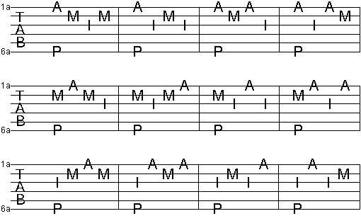 En cada uno de estos ejercicios el pulgar debe ir cambiando de cuerda mientras toca la 4ta, 5ta, y 6ta cuerdas de manera alternada.