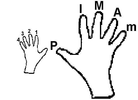 Para los dedos de la mano derecha usaremos sus nombres: Pulgar, Índice, Medio, Anular y Meñique.